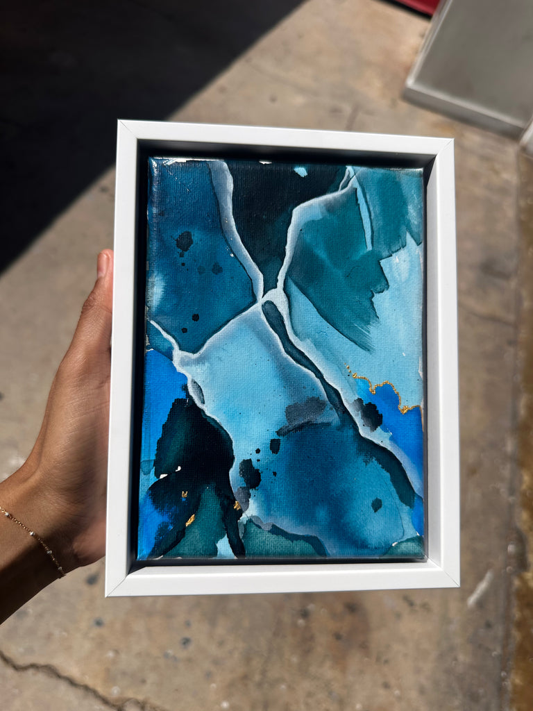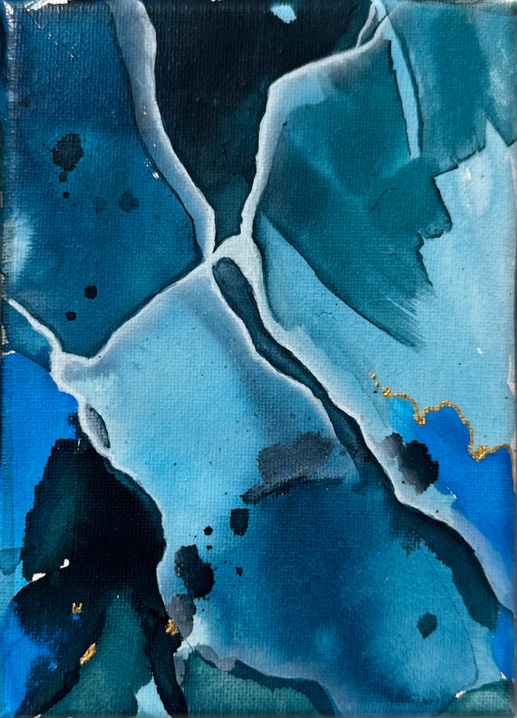 Glacially Erect is a limited abstract art series inspired by the timeless beauty and power of glaciers. Each original painting features intuitive brushstrokes, marbled icy blues, and shimmering veins of genuine 23k gold inspired by the Japanese art of kintsugi — the practice of honoring cracks and fractures with gold.