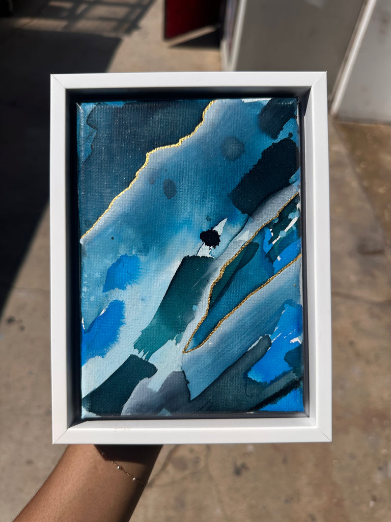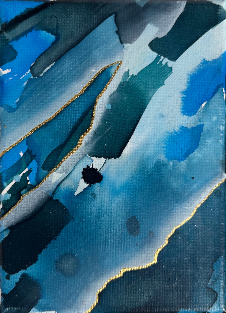 Glacially Erect is a limited abstract art series inspired by the timeless beauty and power of glaciers. Each original painting features intuitive brushstrokes, marbled icy blues, and shimmering veins of genuine 23k gold inspired by the Japanese art of kintsugi — the practice of honoring cracks and fractures with gold.