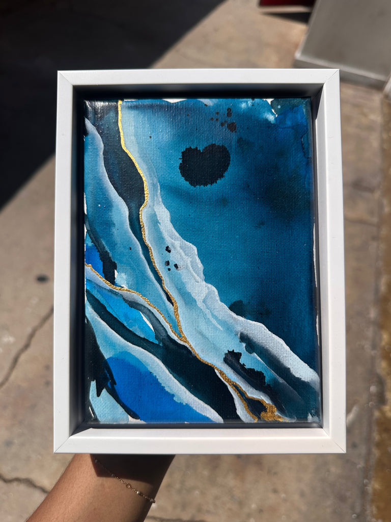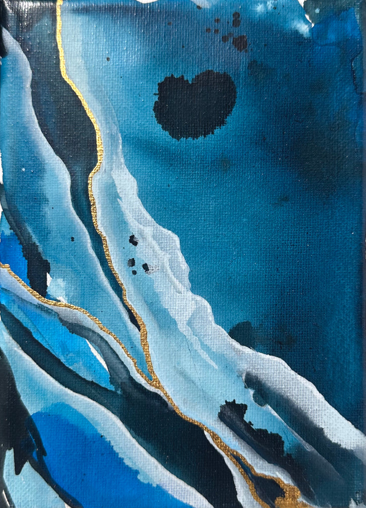 Glacially Erect is a limited abstract art series inspired by the timeless beauty and power of glaciers. Each original painting features intuitive brushstrokes, marbled icy blues, and shimmering veins of genuine 23k gold inspired by the Japanese art of kintsugi — the practice of honoring cracks and fractures with gold.